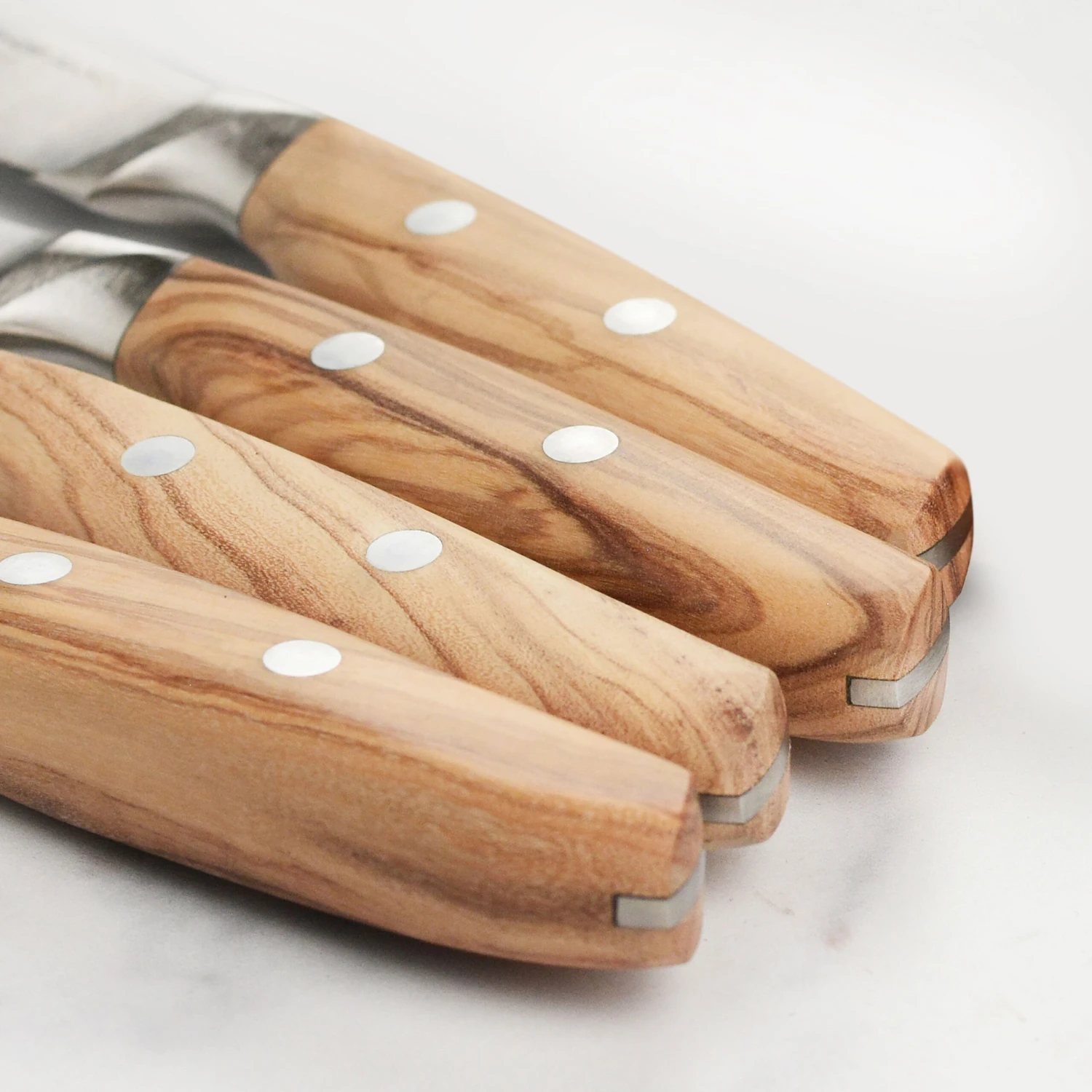 - Distinctive, striking grain Calabrian olive wood handle, finished with stainless steel rivets; naturally water-repellent and antibacterial