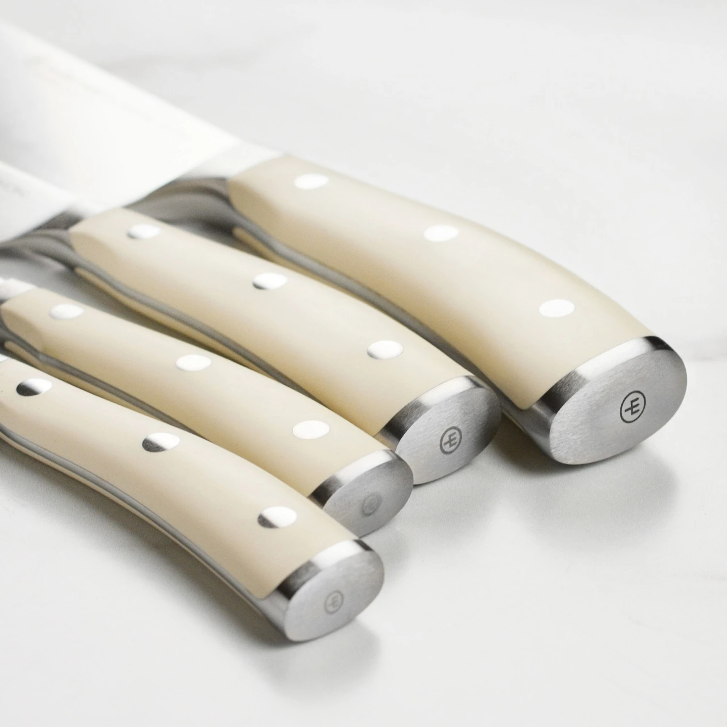 - Contoured triple-riveted creme synthetic handle designed for comfort and control