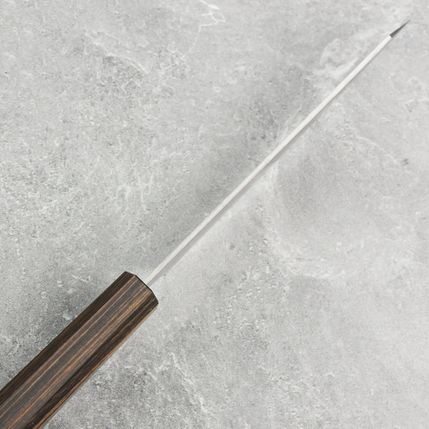 - Octagonal walnut color pakkawood handle is permanently and seamlessly fitted to the blade for comfort and control