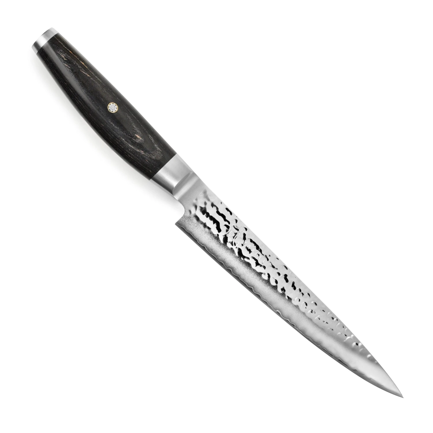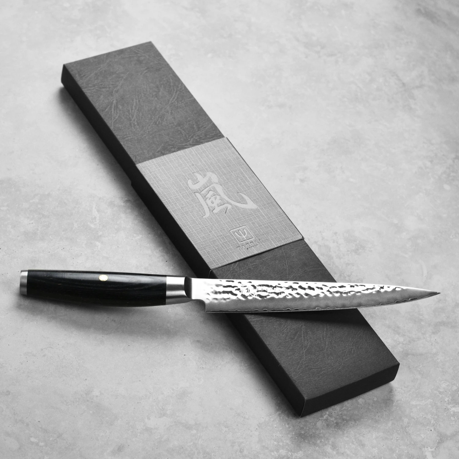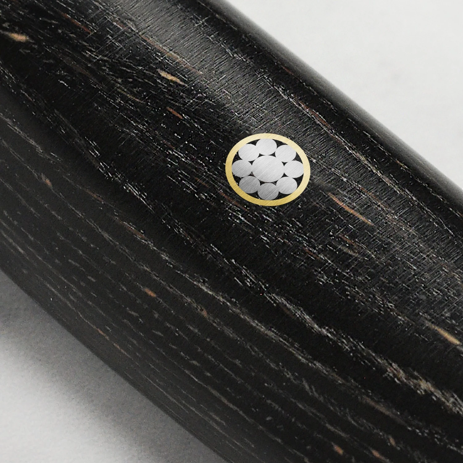 - Black beech pakkawood handle with traditional Japanese Samurai family crest; stainless steel embossed end cap