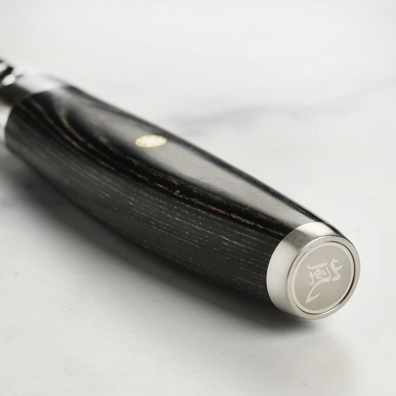 - Black beech pakkawood handle with traditional Japanese Samurai family crest; stainless steel embossed end cap