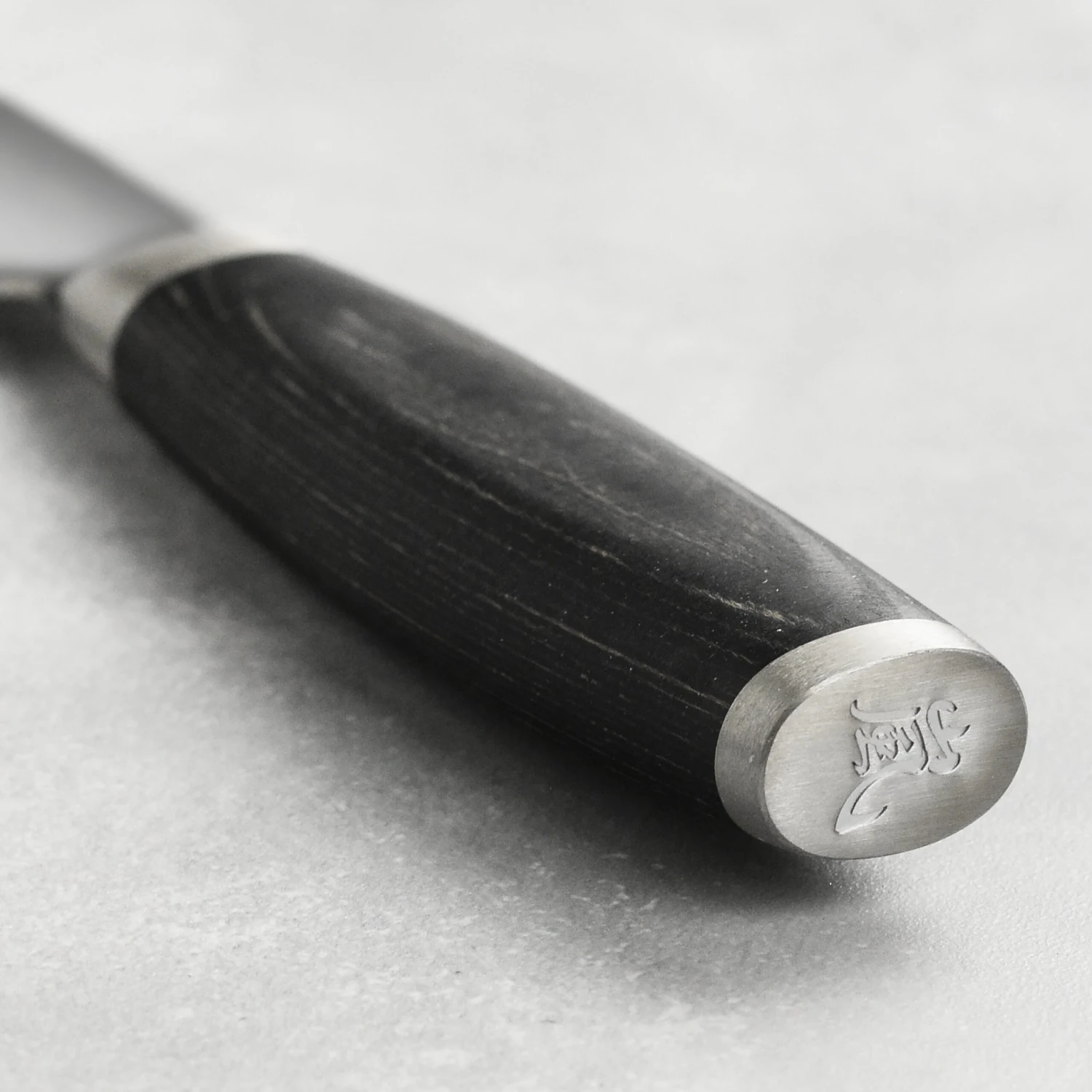 - Black beech pakkawood handle with brushed stainless steel bolster and embossed end cap