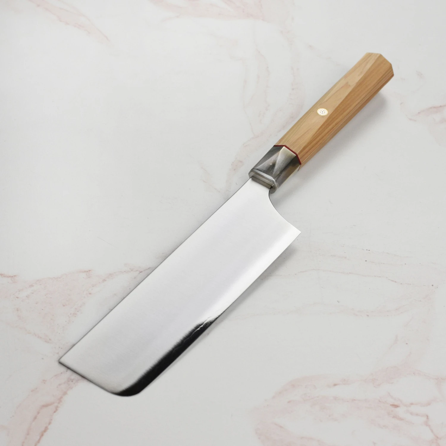 - Twisted octagonal Hinoki wood handle with red spacer and Japanese mosaic accent pin
