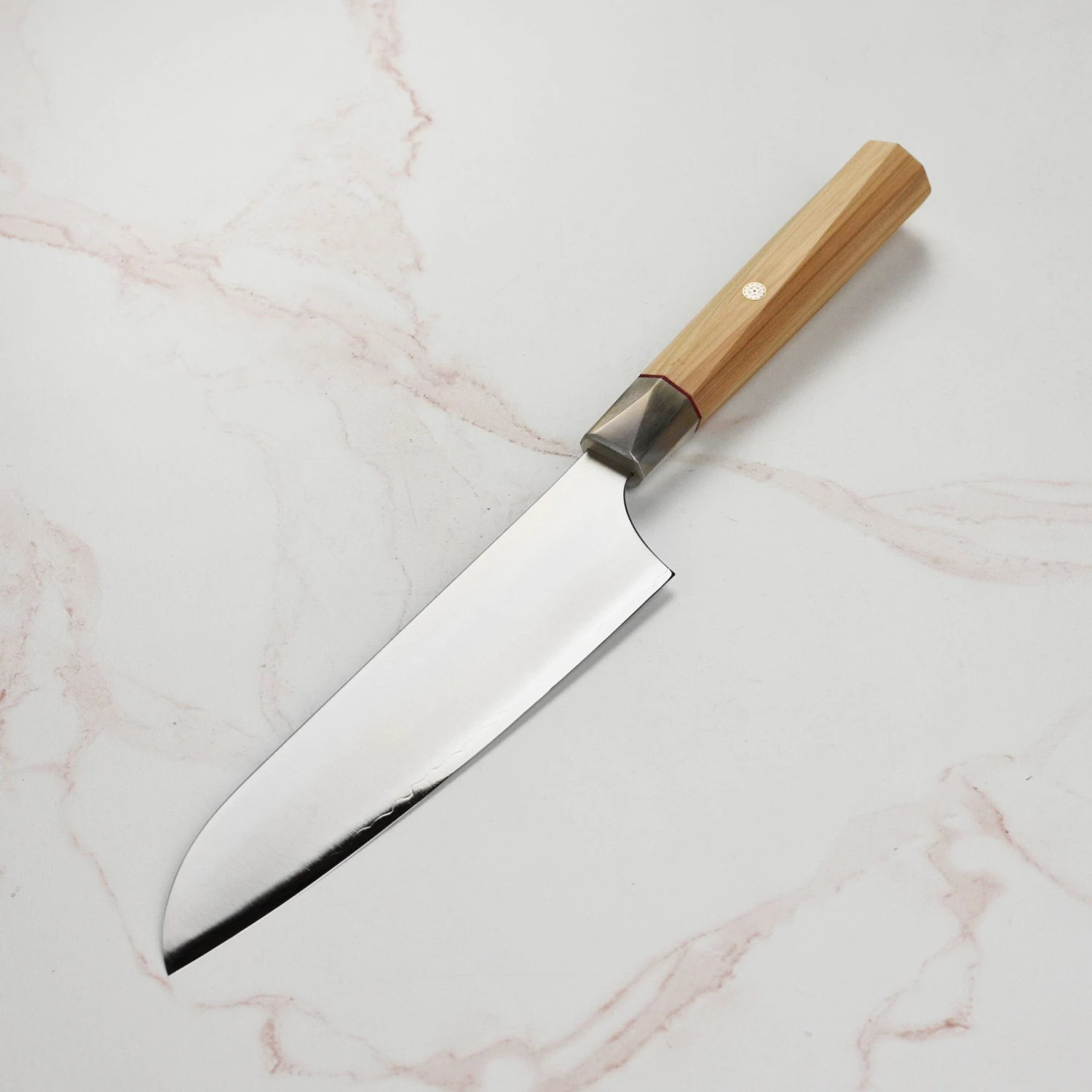 - Twisted octagonal Hinoki wood handle with red spacer and Japanese mosaic accent pin