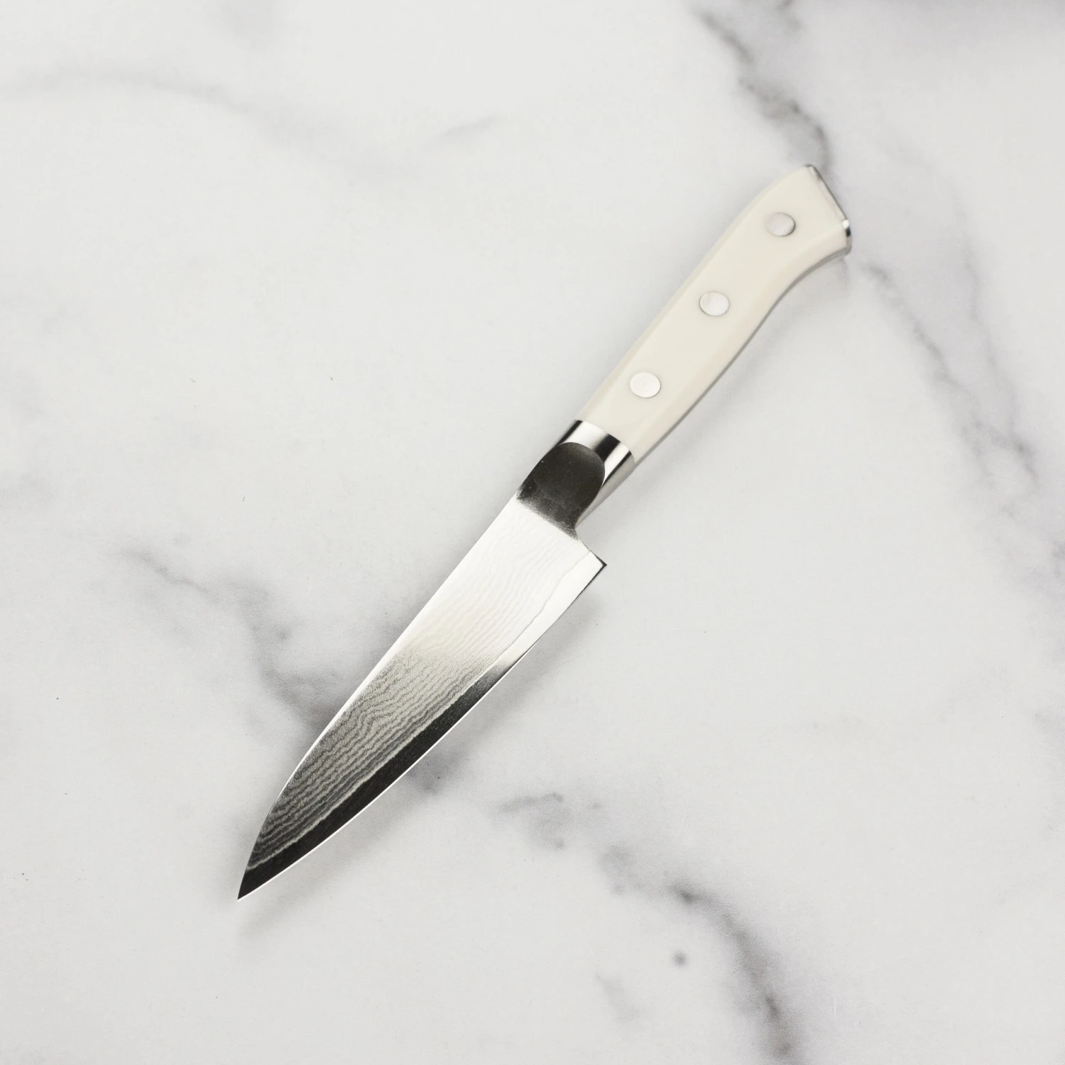 - Triple-rivet white Corian handle with stainless half-bolster and engraved end cap