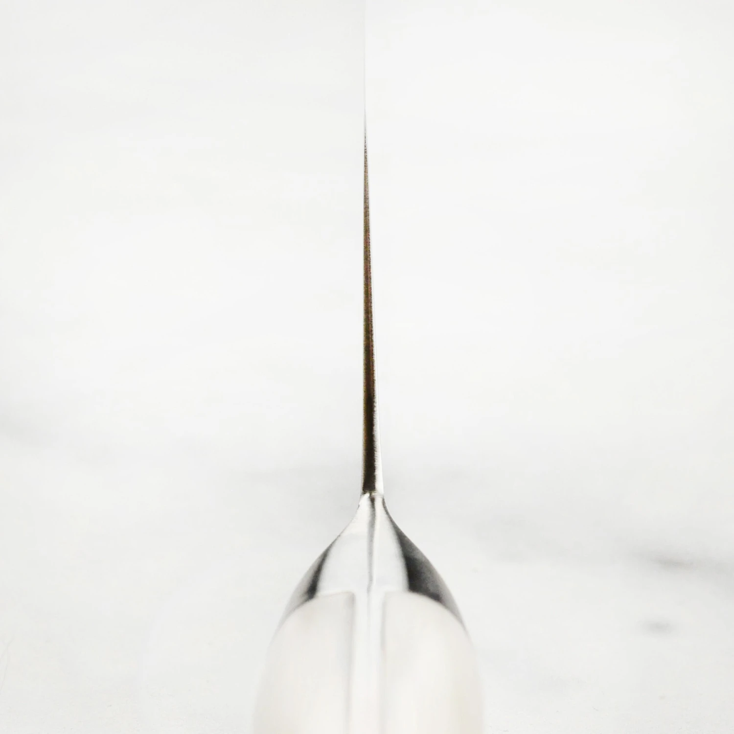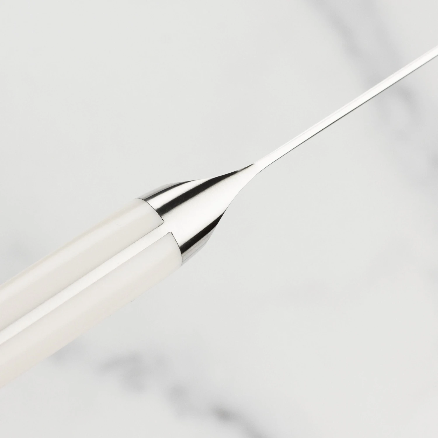 - Triple-rivet white Corian handle with stainless half-bolster and engraved end cap