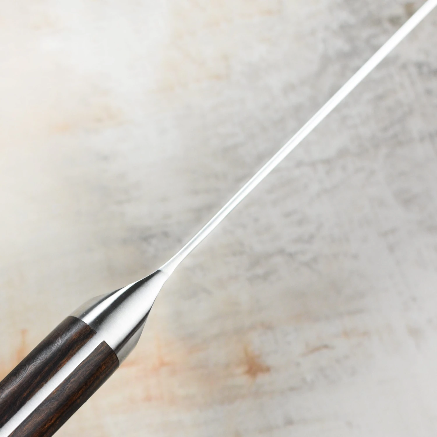 - Triple-rivet Ironwood handle with stainless half-bolster and engraved end cap