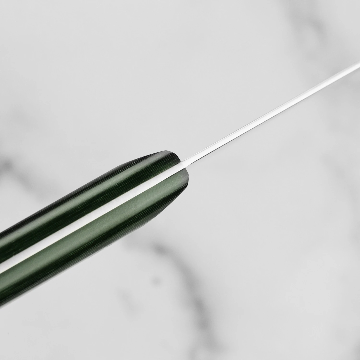 - Triple-rivet Green Micarta handle with stainless engraved end cap
