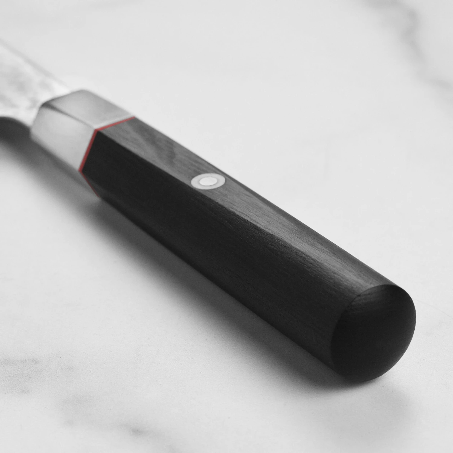 - Black Pakkawood octagonal handle with red spacer and Japanese mosaic accent pin
