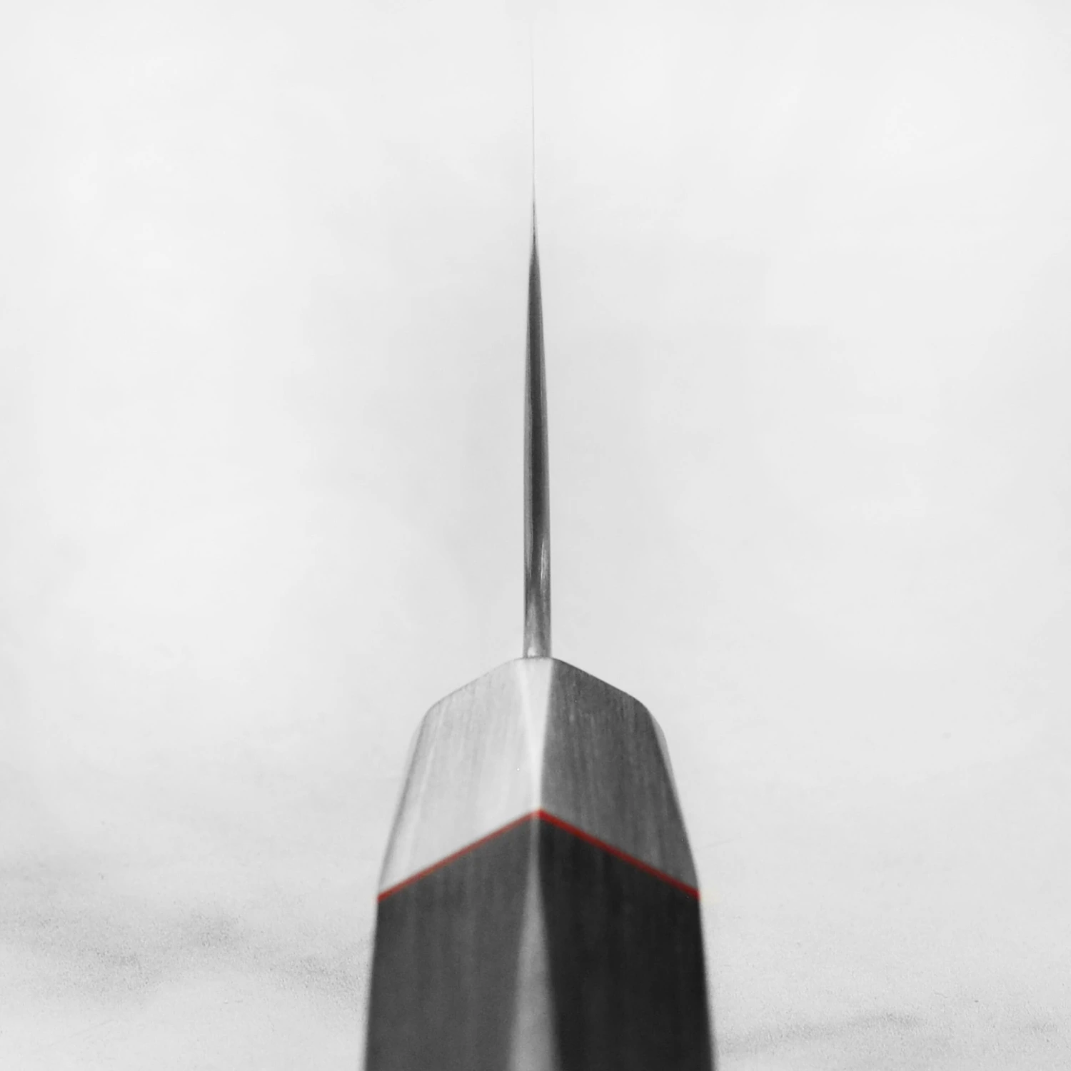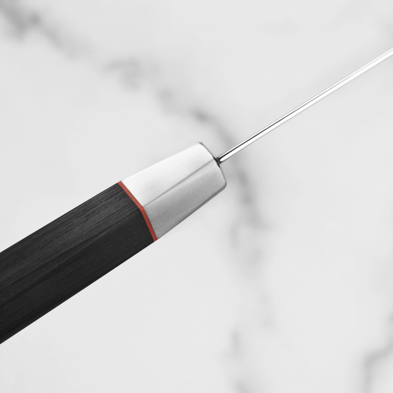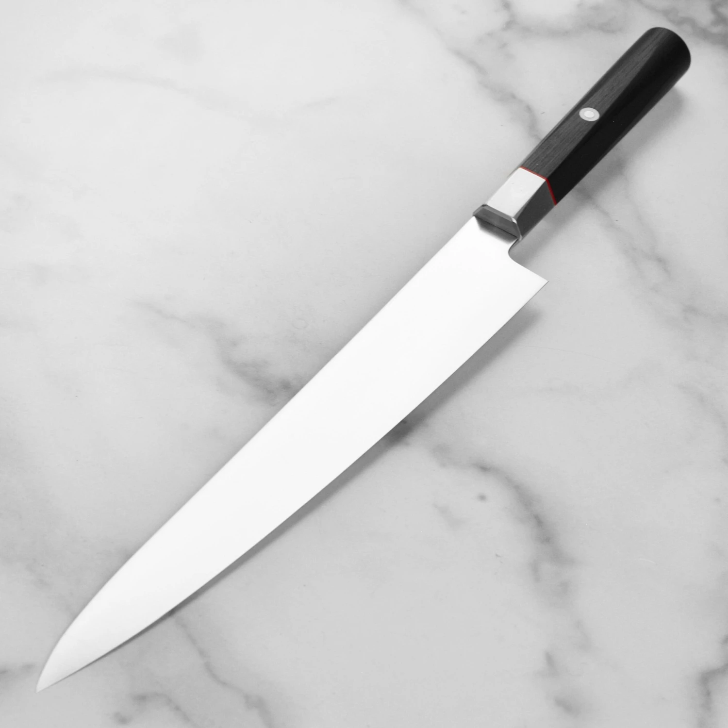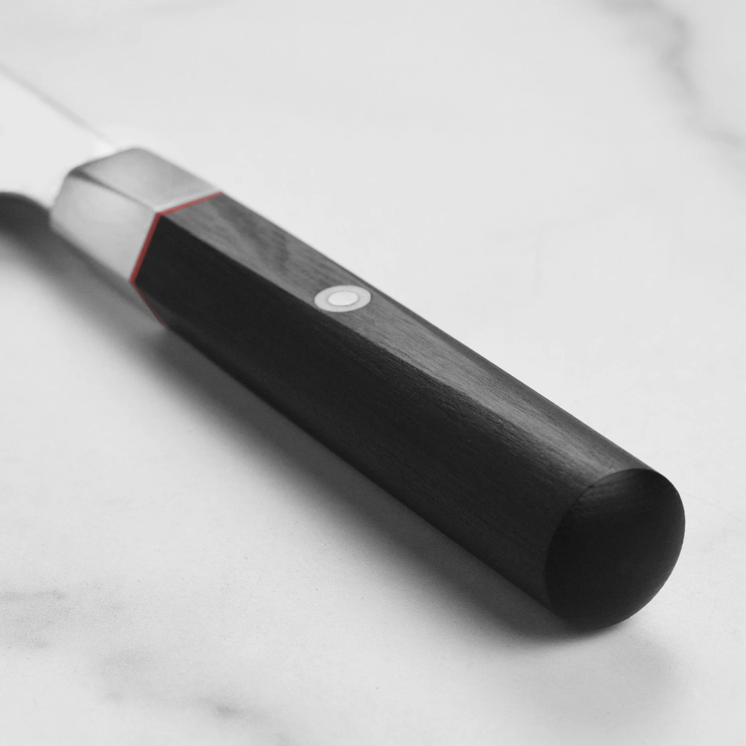 - Black Pakkawood hexagonal handle with red spacer and Japanese mosaic accent pin