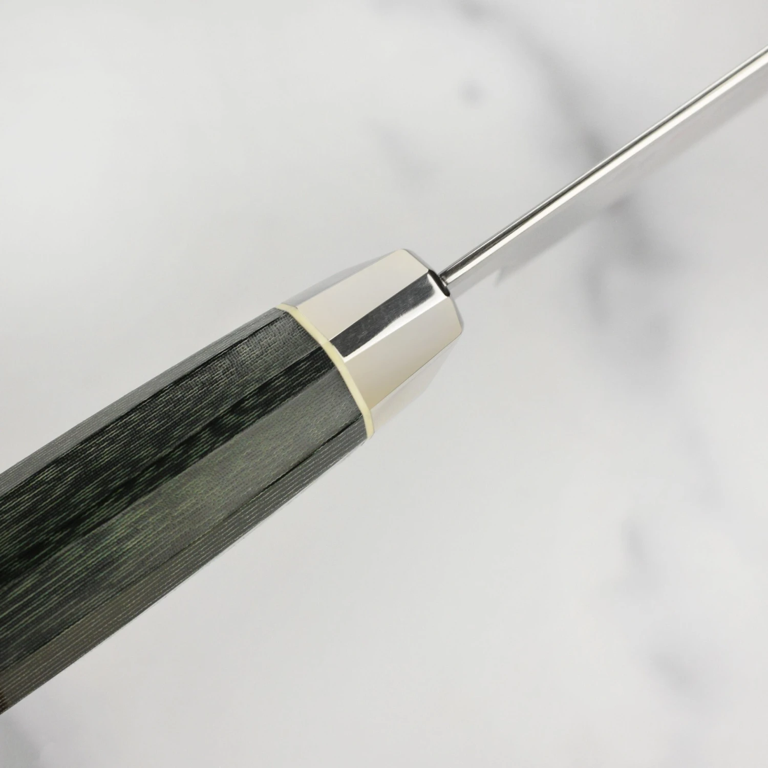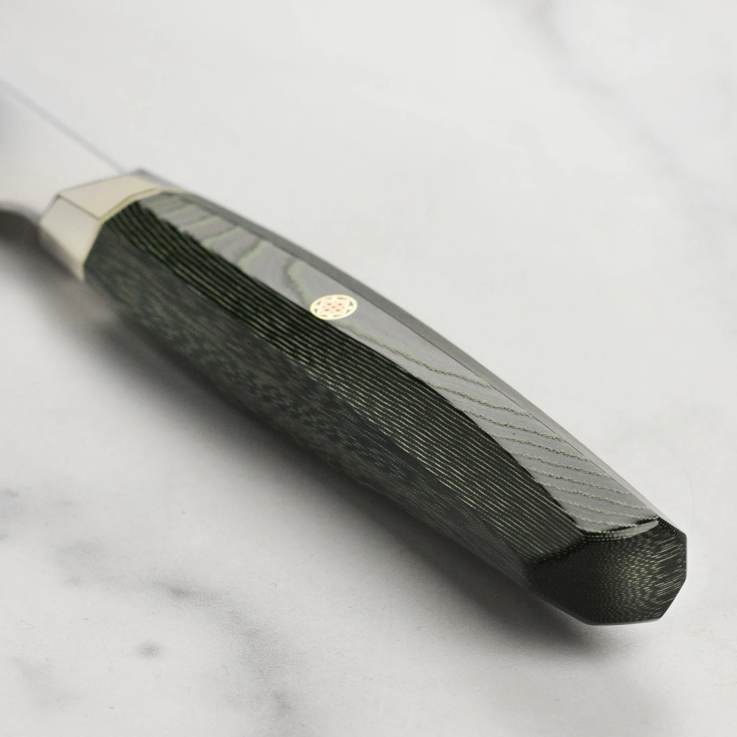 - Green Micarta handle with white spacer and Japanese mosaic accent pin