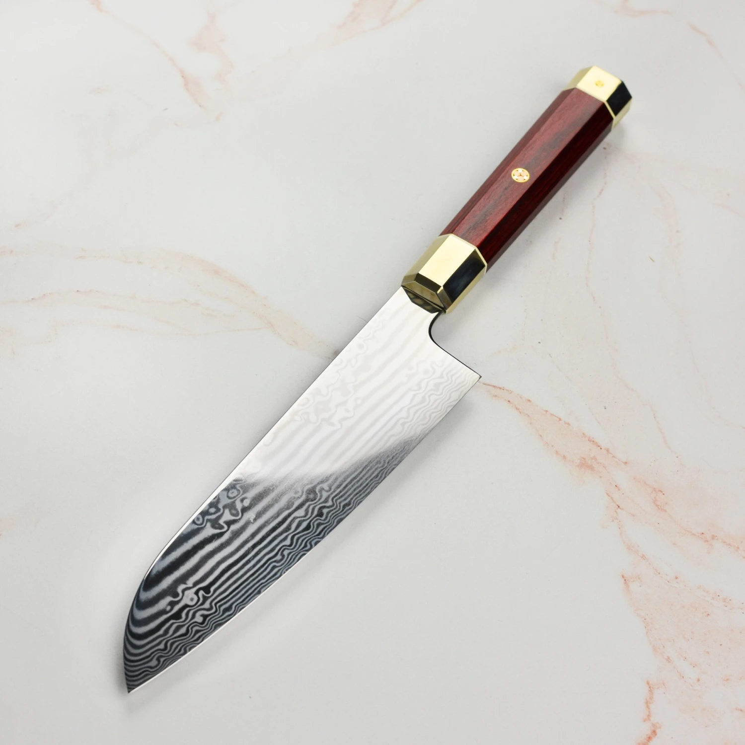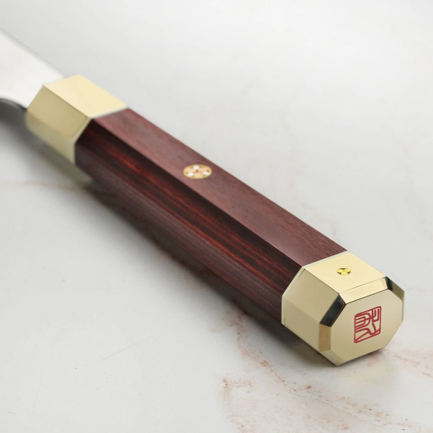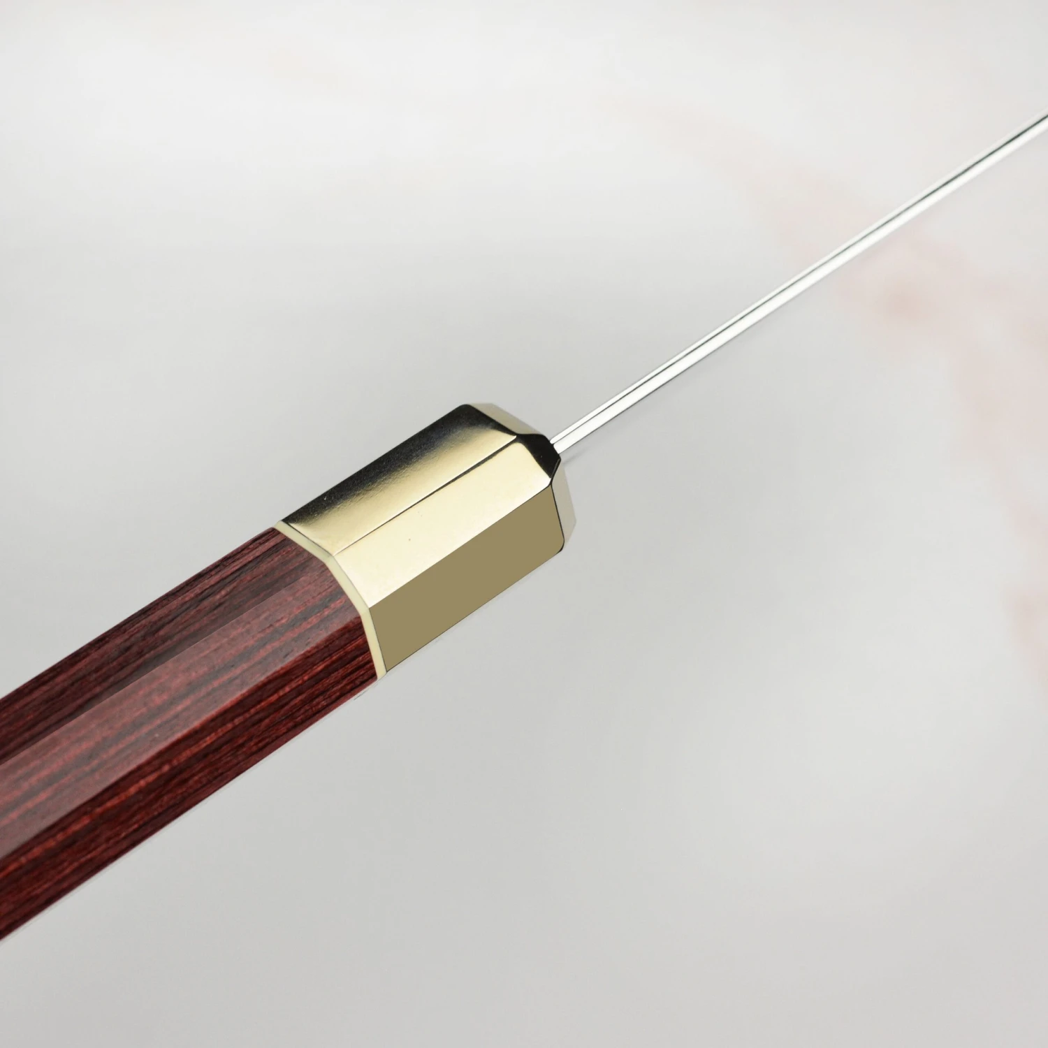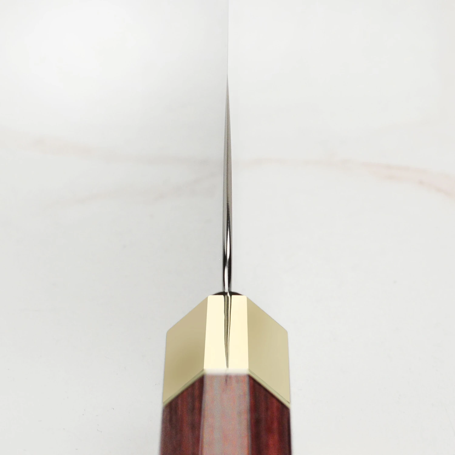 - Red Pakkawood octagonal handle with white spacers and Japanese mosaic accent pin