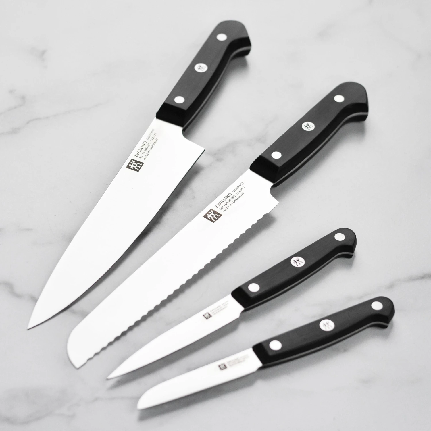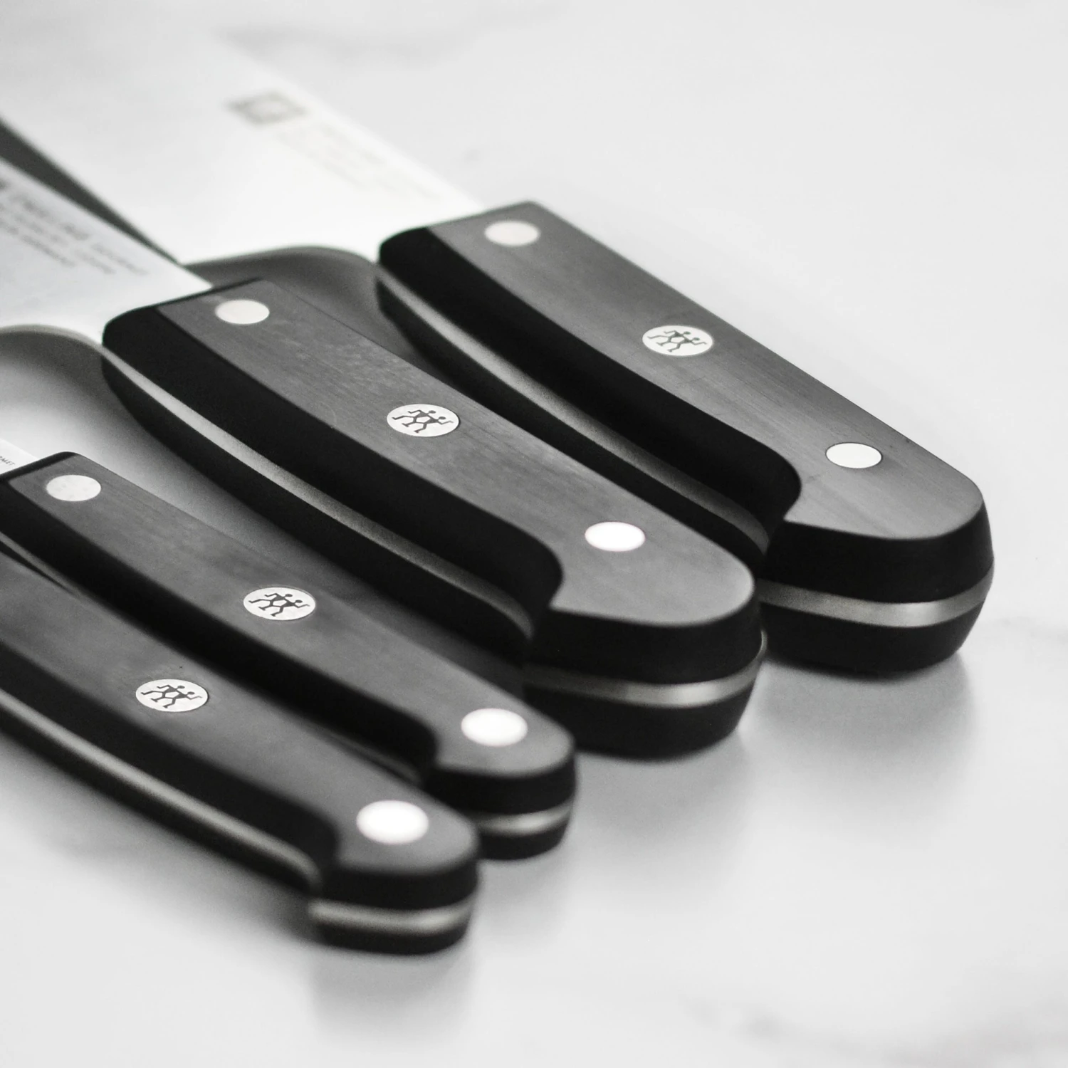 - Traditional three-riveted handle with a full tang provides maximum comfort and stability while cutting; center rivet is laser inscribed with Zwilling logo