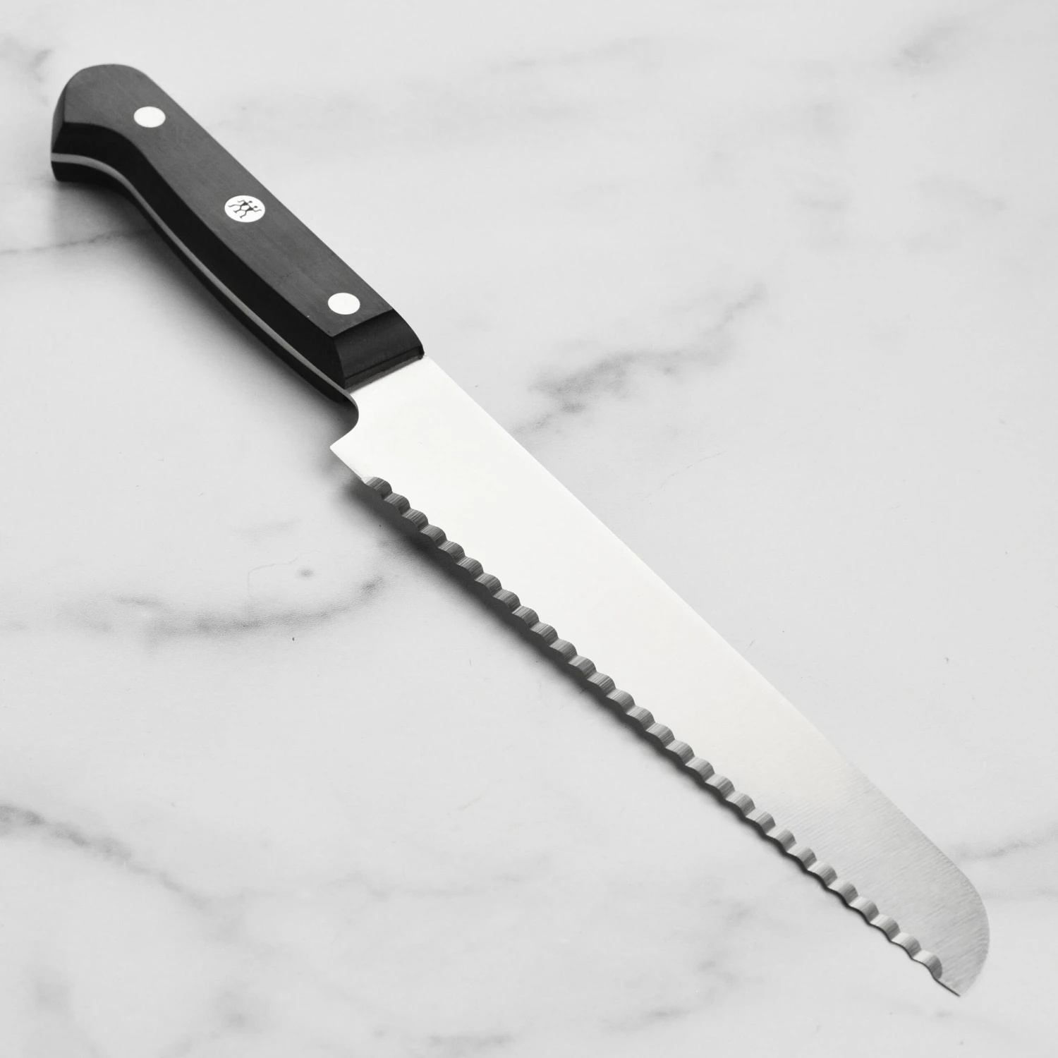 - Traditional three-riveted handle with a full tang provides maximum comfort and stability while cutting; center rivet is laser inscribed with Zwilling logo