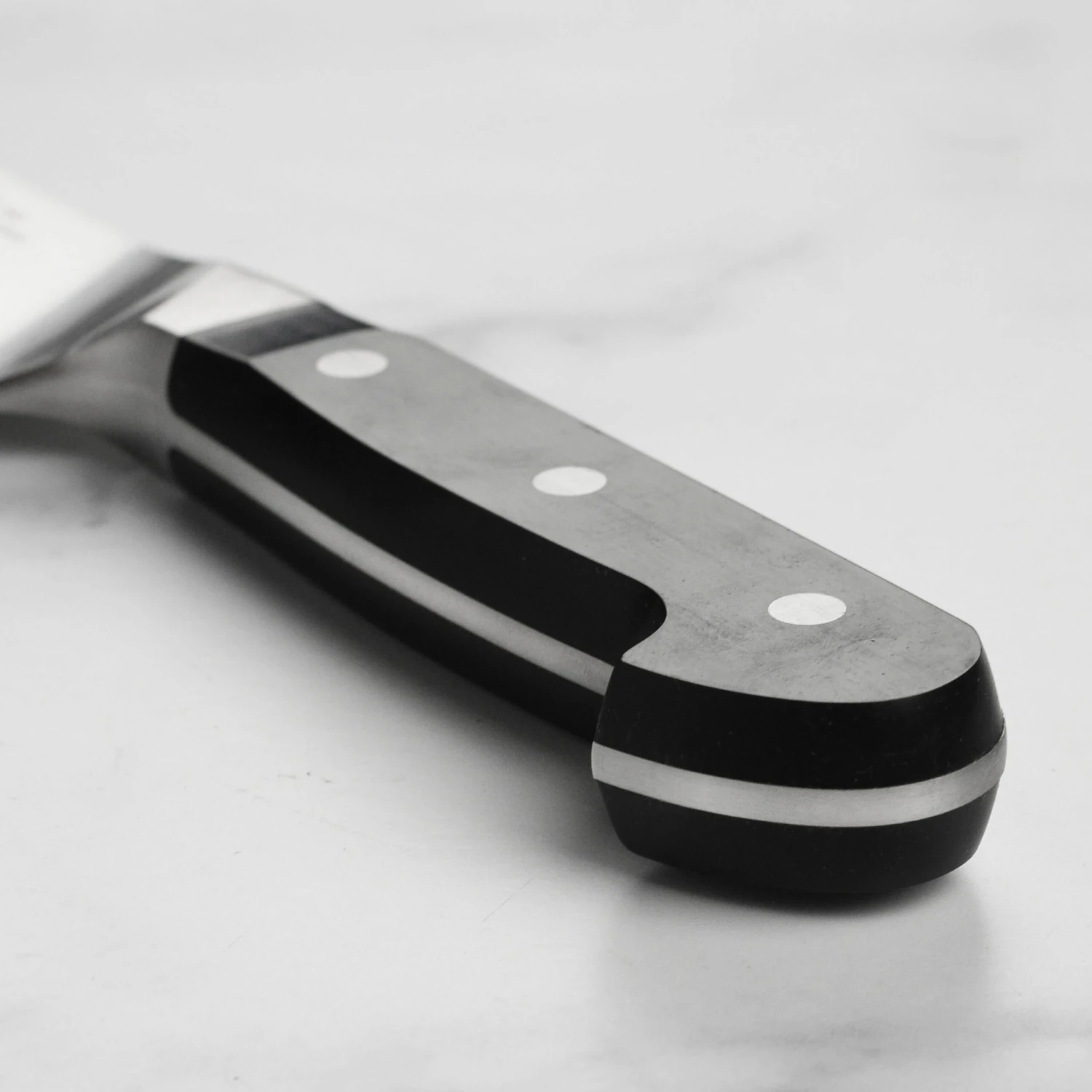 - Full tang with curved bolster provides solid grip and balance; comfortable and traditional 3-rivet resin handle