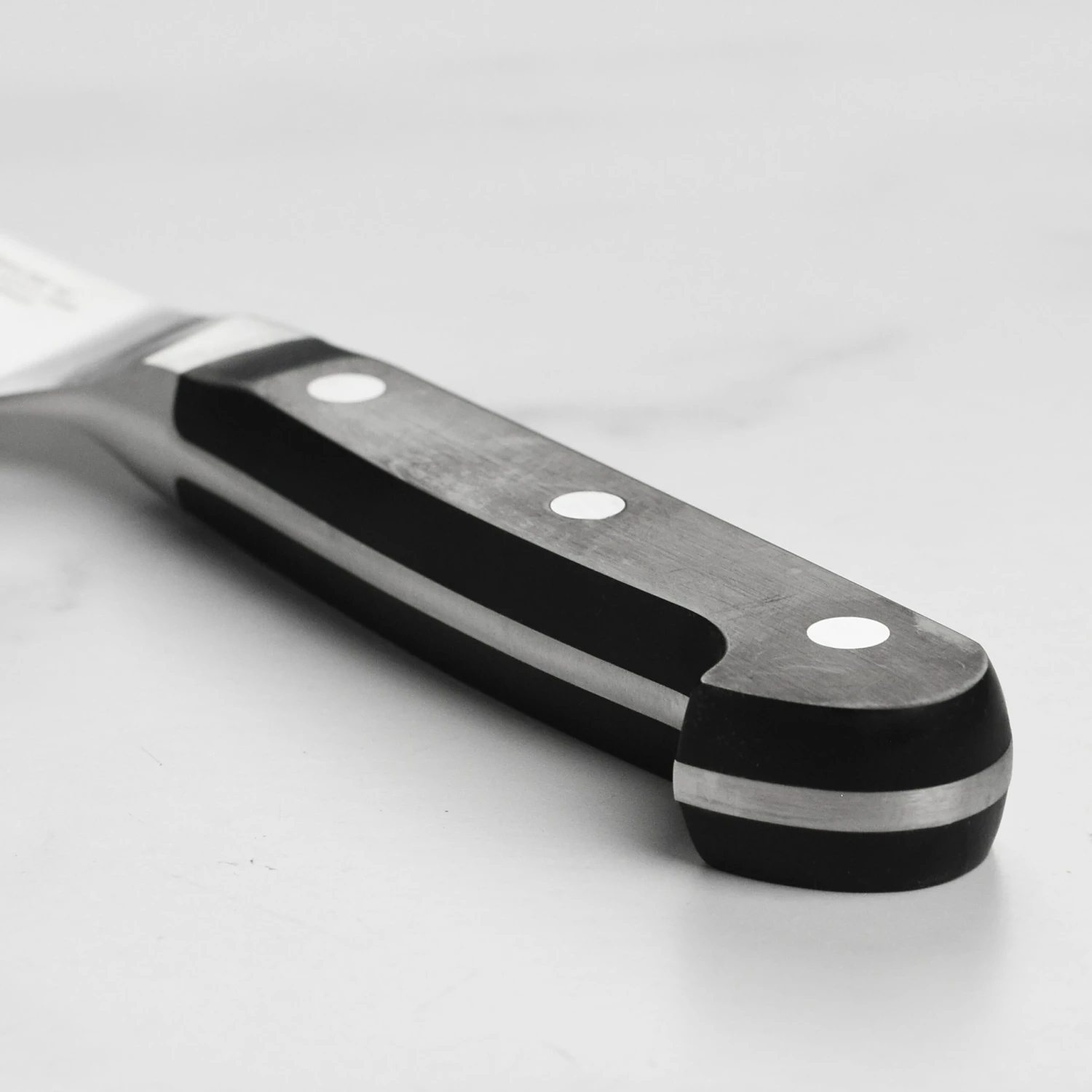 - Full tang with curved bolster provides solid grip and balance; comfortable and traditional 3-rivet resin handle