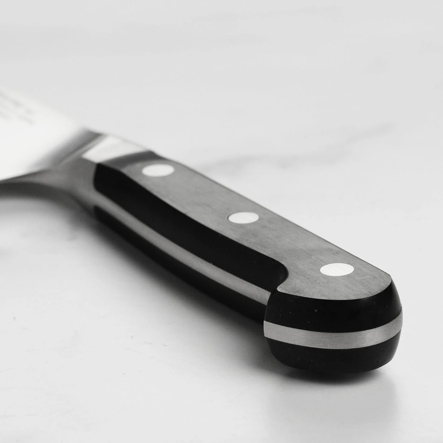 - Full tang with curved bolster provides solid grip and balance; comfortable and traditional 3-rivet resin handle