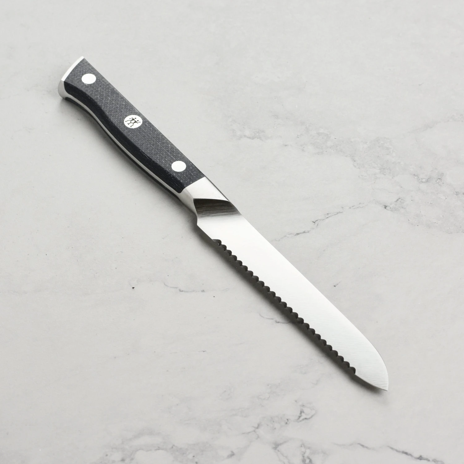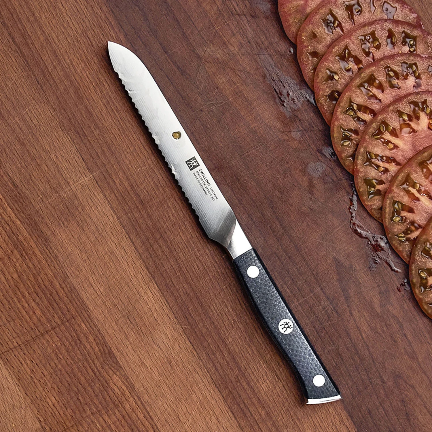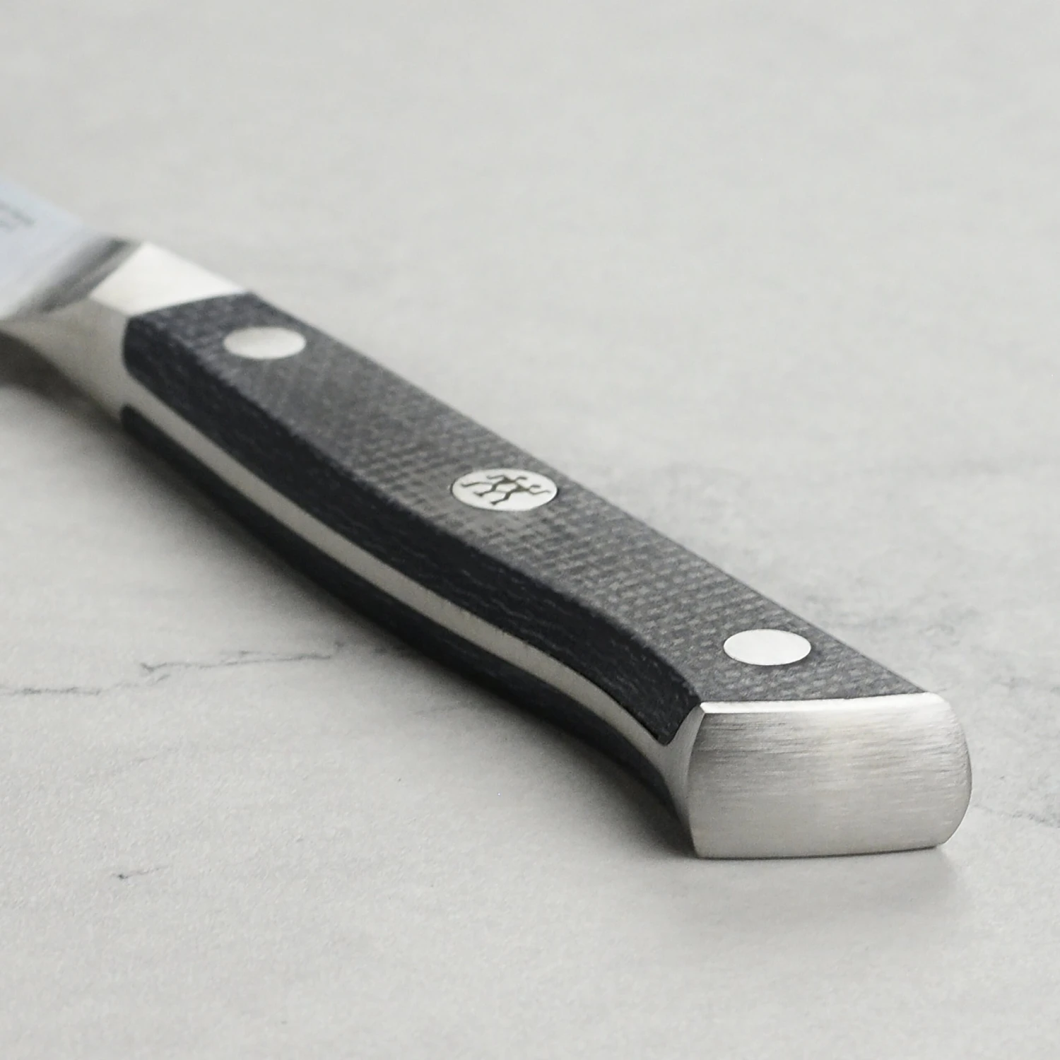 - Moisture-resistant, non-slip grip jute micarta handle with a triple-rivet design and stainless steel end cap, with Zwilling logo lasered in center rivet